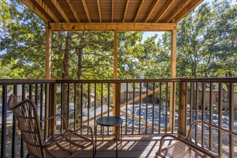 Each one is just a little bit different, but similarly the same. Walk in on the main level to find the treehouse feel in the open area, combination Living Room, Dining Room and Kitchen with views nestled in the trees and lake side. The Living Room includes a flat screen TV, wireless internet and access to the deck. Dining and Kitchen will have plenty of seating for your group and all the accoutrements of home. They include full sized refrigerator, range, microwave, dishwasher and other small appliances such as toasters and blenders. Also located on the main level is the King bedroom. This bedroom features a flat screen TV, full bathroom and stack washer and dryer.