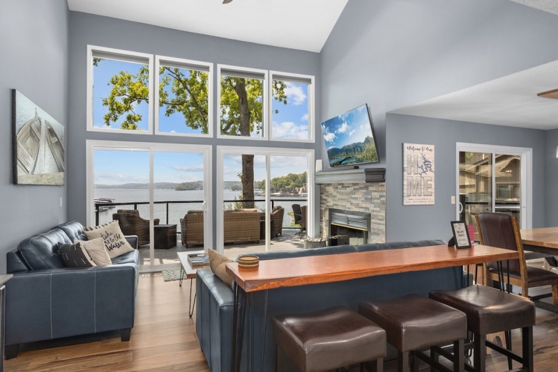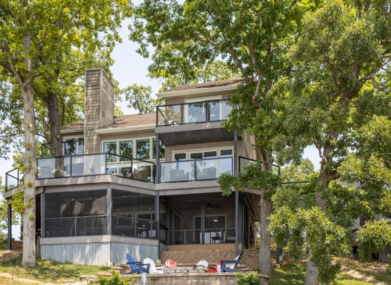 You will love all of the decks, complete with glass railings to allow for great views of the lake. There is plenty of seating on every deck and the dock is just a short walk down from the home.
