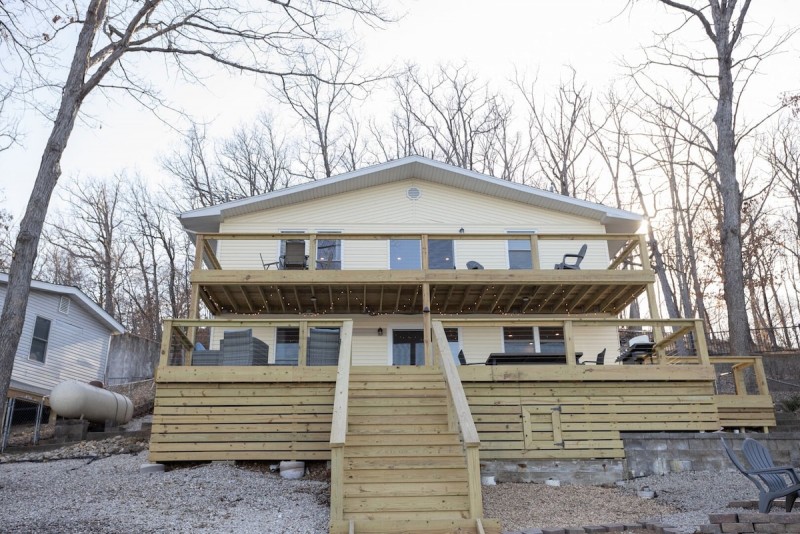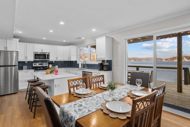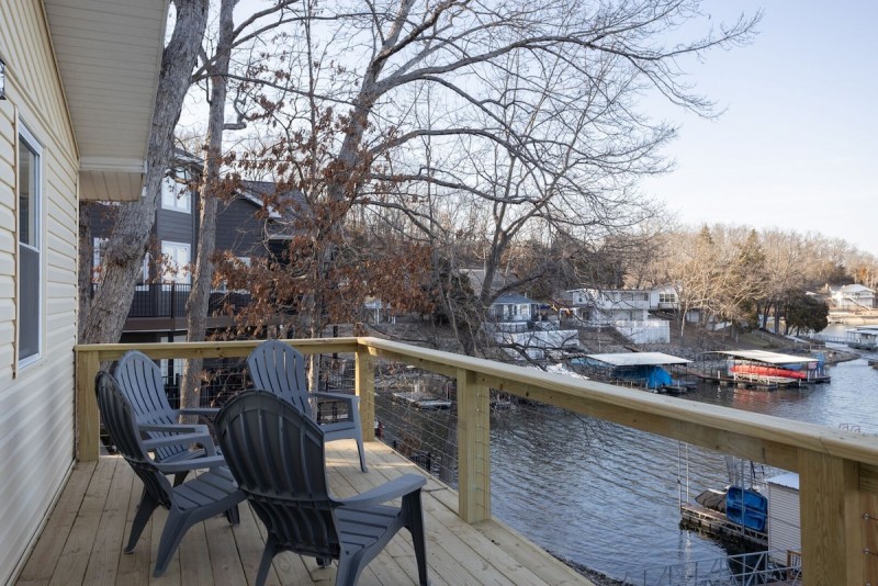 Located on the North Shore of the Lake of the Ozarks, Viewside Getaway features 2 levels of completely remodeled (in 2022) living space! Upstairs you'll find the family room, with couch, TV and 4-top dining table, with access to an open air deck with a nice view overlooking the lake. You'll also find a king bedroom and a queen bedroom upstairs, with a shared full bathroom which includes a shower.
