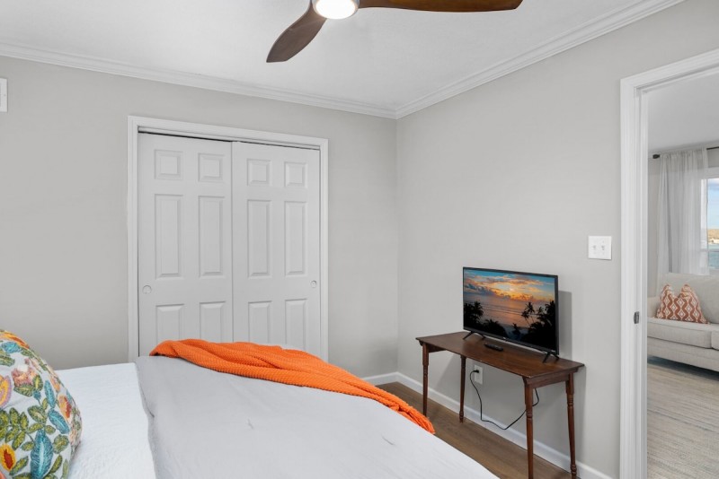 Downstairs you'll find the kitchen, complete with brand new appliances, breakfast bar, dining table and living room. Off the living room is the third bedroom featuring a queen sized bed. Completing the lower level is a full bathroom with a tub/shower combo located just off the kitchen. This home also features a full-sized washer and dryer.