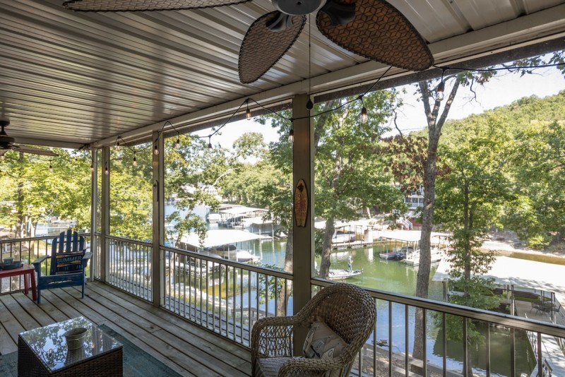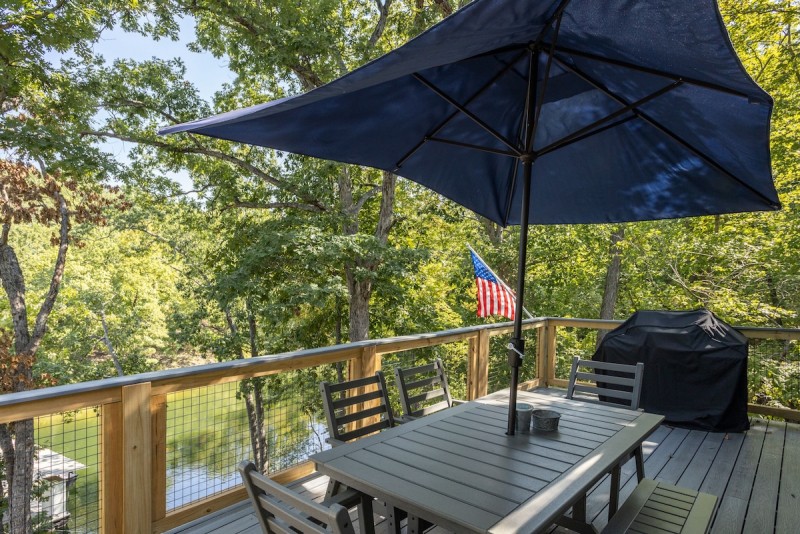 New lakeside "composite" deck runs the length of the main level and includes a beautiful new 6 top table, lounge chair and gas grill. The view encompasses the firepit below (with 4 new Adirondack "composite" chairs + 2 tables), the shoreline of the lake, and the boat dock itself (located at the end of a cove) with swim platform. If the 10 x 24 slip isn't big enough for you, there is plenty of room to tie your boat to the side of the dock. There is also fishing gear for guests to use during their stay.