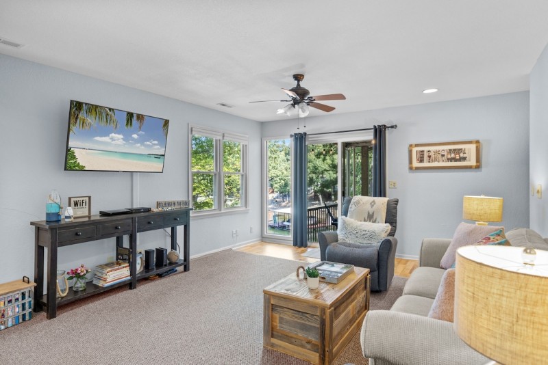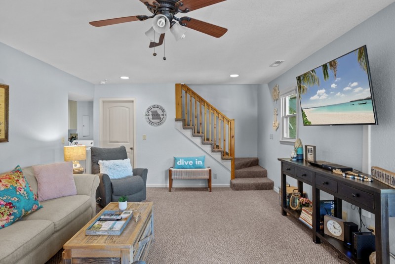 Lower level features the larger Family Room with room to pop up the double high Queen air mattress, 55" Smart TV, DVD player, 2 new Lazy Boy recliners, games, books and screened porch access. Also, this level features 2 Queen bedrooms, both with 32" Smart TV's and DVD players, full guest bath and full sized laundry area. From the family room, enjoy the screened porch with 2 comfortable conversation couch sets, 2 Adirondack chairs and outdoor ceiling fans.