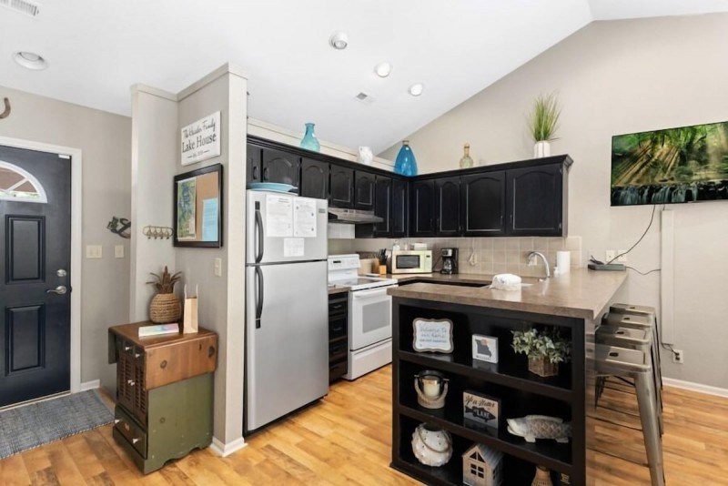 Nestled in the trees at the end of the road, you will have plenty of parking in front of the home for 4 cars plus a boat trailer. Main level features lakeside open concept kitchen with everything you would need, dining room with seating for 10 and sitting area. It also includes the Master Bedroom with King bed, 43" Smart TV, DVD player and access to the new master bathroom.