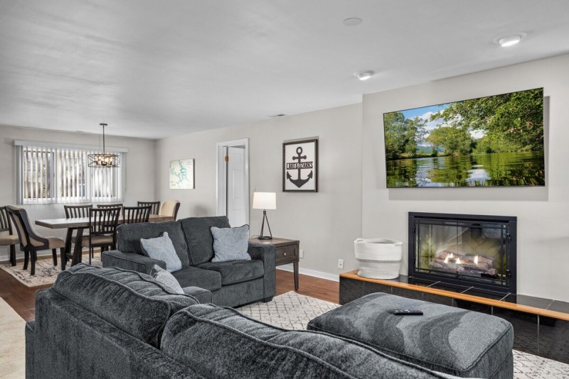 This first floor condo only has one step up into the unit. Enter into the dining room where you'll find a 6-top dining room table, with seating for 2 more at the breakfast bar. Seating in the living room offers a couch and recliner.
