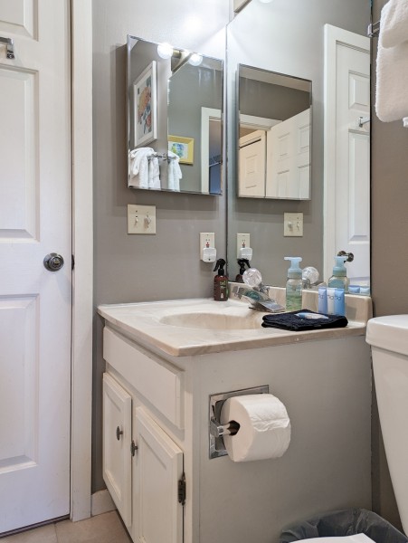The second bedroom has two twin beds and a smart TV. The guest bathroom can be accessed from the guest bedroom or the hall, and features a tub/shower combo.