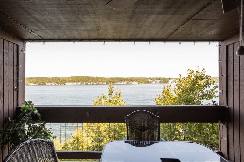 The private deck features a beautiful view of the main channel of the Lake of the Ozarks, a table and chairs, as well as an electric grill.