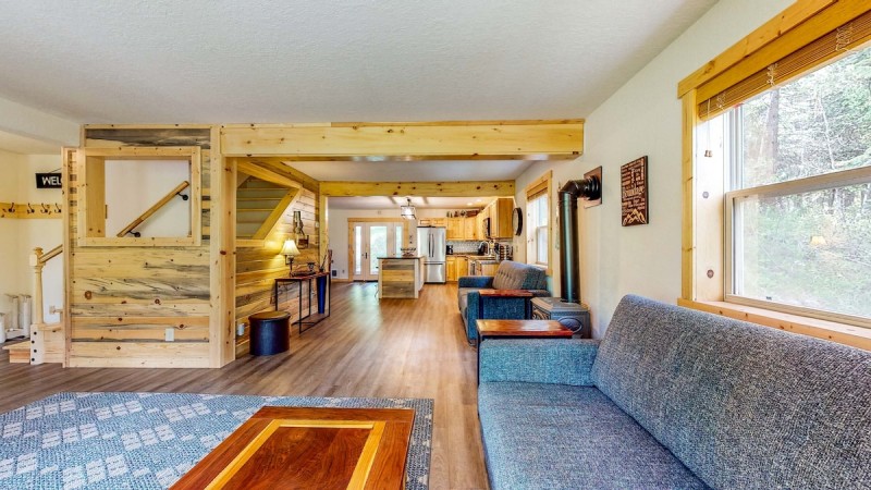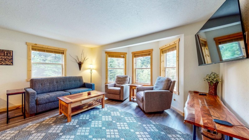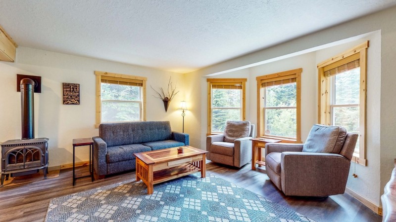 The main level, the open-concept living area is a great gathering place. The full kitchen has been upgraded with stainless steel appliances and new countertops and comes equipped to handle family-style cooking. The dining table has seating for six with an additional 3 at the breakfast bar. In the evenings, everyone can cozy up around the gas fireplace and play games or watch a movie on one of the included streaming services.