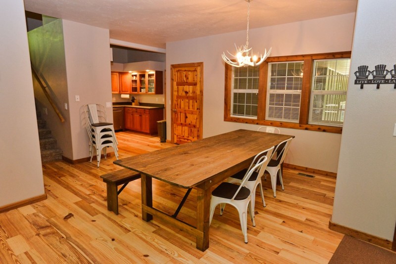 This two level, four bedroom and three bath home can accommodate up to twelve guests in comfort. Newly furnished from top to bottom, there is a private place for everyone. Open living space with picture perfect windows lets the woodland outdoors in with plenty of natural light. There is living room and bedroom access to the large deck perched at the tree line where guests can enjoy the large hot tub and soak their cares away. With comfy deck furnishings and gas grill, many a meal can be enjoyed outdoors.