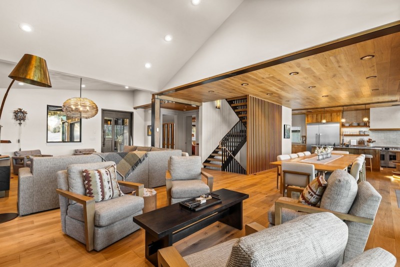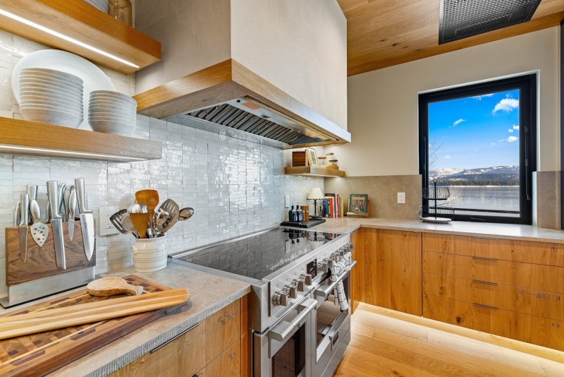 An open floor plan of kitchen, dining, and living space. The kitchen is designed for large family gatherings with an Island, passthrough windows to the patio, and oversized appliances, including a refrigerator/freezer, oven, and induction range. The induction range with stainless steel cookware speeds up cooking time and is safer for little hands. A microwave, dishwasher & additional beverage fridge as well. Dine in elegance overlooking Payette Lake. The table seats 12 and has an additional 4 indoor barstools. Sit by the gas fireplace and gaze out over the lake or curl up on the oversized couch with family to stream a movie. Living space opens to a patio with unobstructed views of Payette Lake, outdoor bar seats 4, dining for 12, and a gas grill. 2 car garage for guest use. Coming in from Skiing? Drop zone with laundry room and 8 individual locker-style cabinets with vented airflow system to dry those jackets and boots. The main floor master bedroom has a gas fireplace and sound blocking to help you sleep soundly.