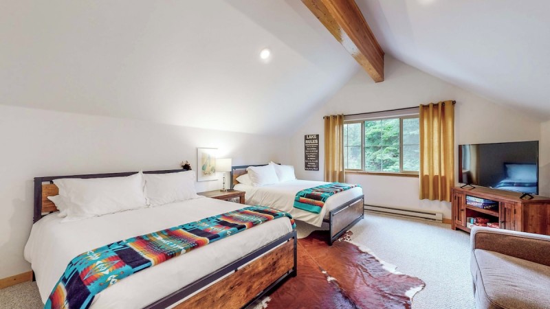 Retreat to serene bedrooms, each designed with your utmost comfort in mind. Sink into plush beds with crisp linens. Wake up to views of the forest all around you. The bathrooms are stocked with everything you need to freshen up after a day on the lake, riding the trails, or hitting the slopes.