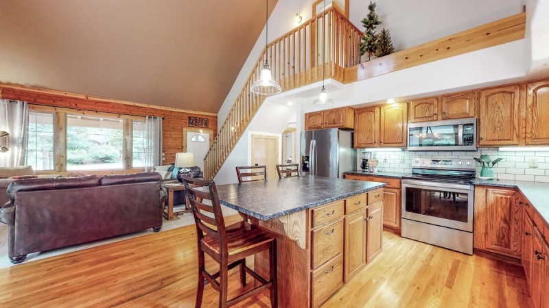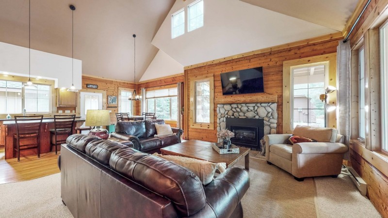 Step inside and be greeted by a warm, inviting ambiance. The interior exudes rustic log cabin charm blended seamlessly with modern comforts. The vaulted living area invites you to unwind in front of a river-stone fireplace. Cozy up on the couch with a good book, enjoy a family movie night, or circle around the large coffee table for a card game!
