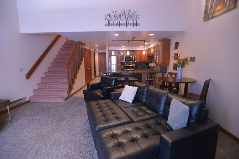The condo features a cozy living room with wood burning stove (guests must provide their own wood) and big screen TV. Petite patio access from the living space opens onto a grassy common area. This property is just two doors down from the pool and is across from the tennis courts. Meals are hassle free in the well-equipped modern kitchen. Beautiful cabinetry, stone countertop, stainless steel appliances, and creatively lit workspace with counter seating make “eating in” an experience for you and your guests. Don't feel like cooking? Nearby downtown McCall offers a variety of dining venues and is less than one mile away.