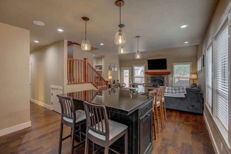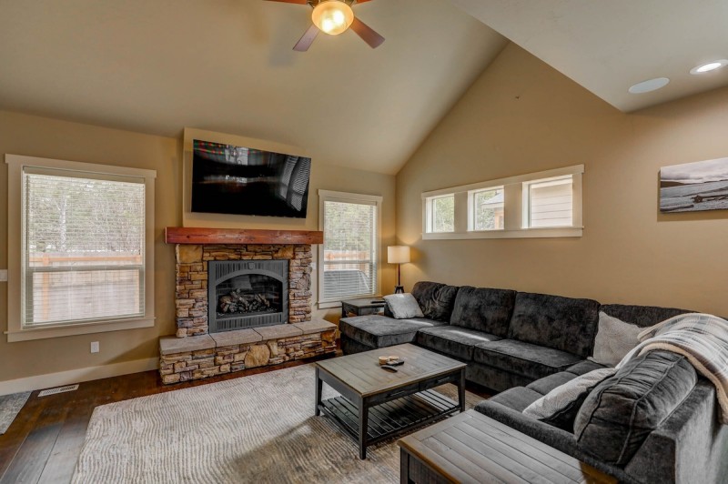 The home has been remodeled with a striking stone wall that surrounds a large propane fireplace in the main floor living room. There is also an oversized L-shaped couch to enjoy it all. Upstairs in the loft there is a second living area with smart TV, blu-ray player, and a sofa sleeper. You will also find the second master with attached bathroom, a game room, and another hall access bathroom upstairs.