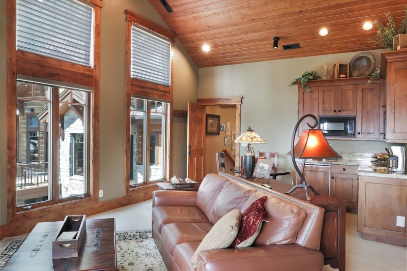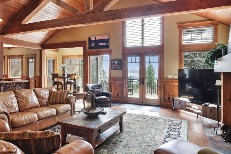 The main level of the home has a great room, kitchen, dining, sauna, full bath, multi door access to the decks as well as a king bedded room with TV and full bath. This level connects to the apartment. The upstairs floor has the master suite with king bed, sitting area, fireplace, private office, and full bath with jetted tub and walk in shower. Guests can enjoy relaxing in the tub while enjoying the flow through the fireplace. Master suite has its own deck with forest and ski run views. The loft/sitting area has a sleeper sofa. TVs located in the master, office and sitting area.
