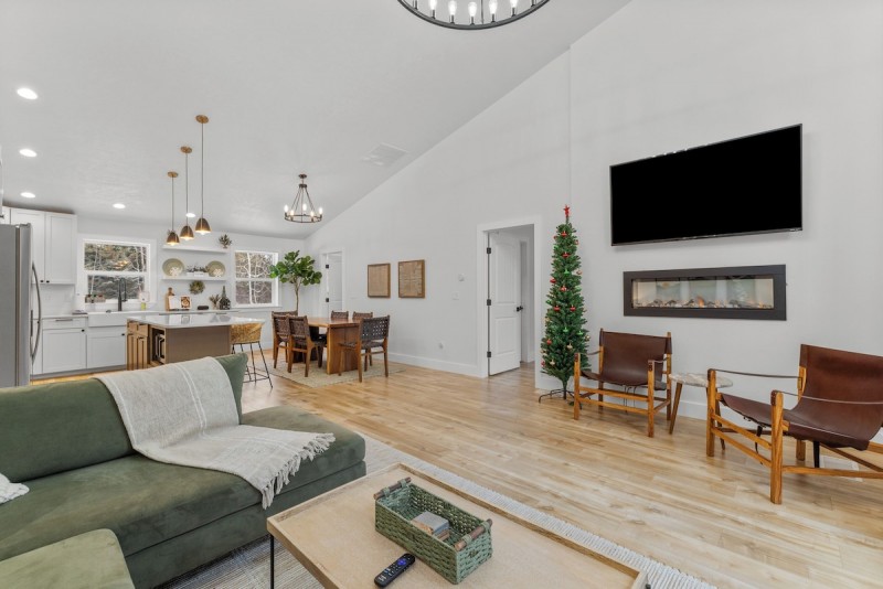 Inside, this cabin is designed for relaxation and comfort, with large windows that flood the space with natural light and offer beautiful forest views, ensuring privacy and serenity. The open-concept living area features modern finishes, an electric fireplace, and high-end amenities, including a full-sized washer/dryer, HD TVs, and a luxurious master bathroom with a walk-in shower.
