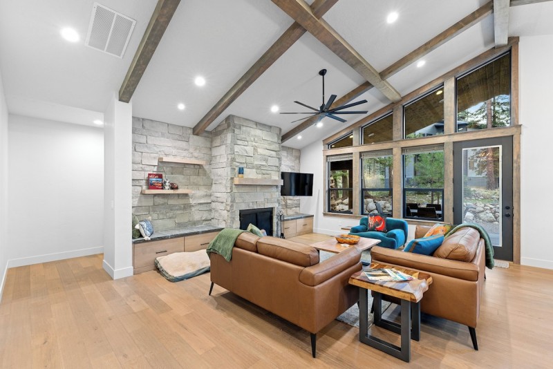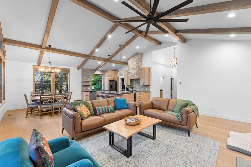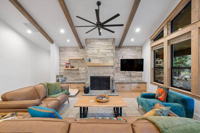 This brand-new mountain modern home offers everything you need for a relaxing stay. Enjoy the comforts of air conditioning and Wi-Fi throughout this single level, four-bedroom, three bath property.