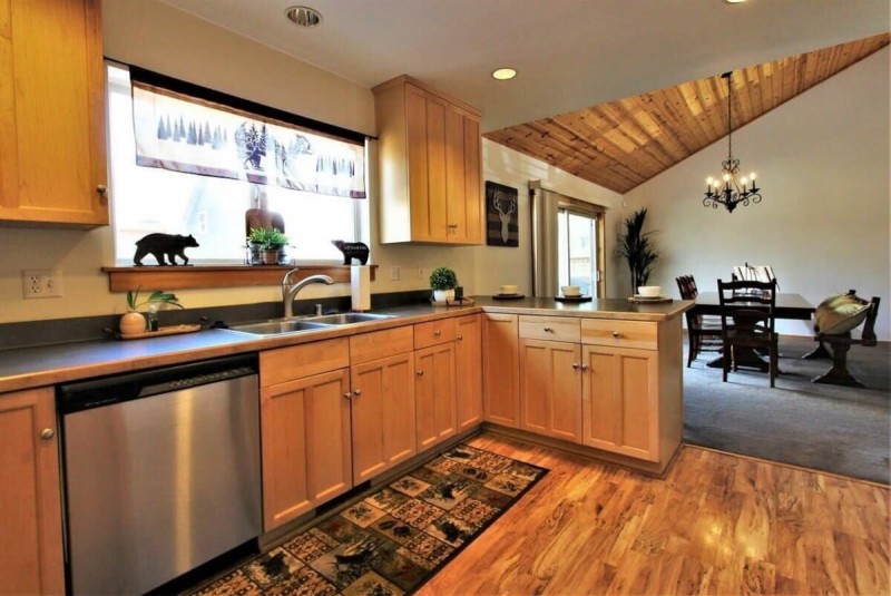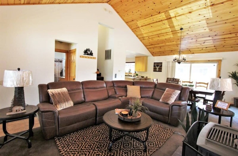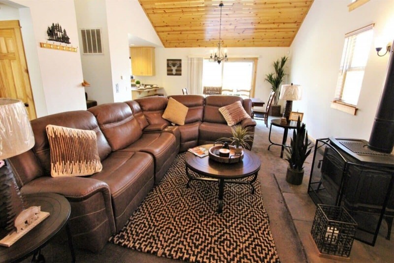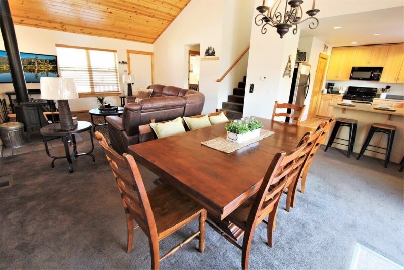 Step into the light and bright Living Room and instantly get the mountain vibe with the vaulted, knotty-pine ceilings and cozy wood-burning stove. There is plenty of comfortable seating and a large TV with cable for your entertainment. There is WiFi as well for all your devices. This is the perfect spot to kick back after a long day of mountain fun!