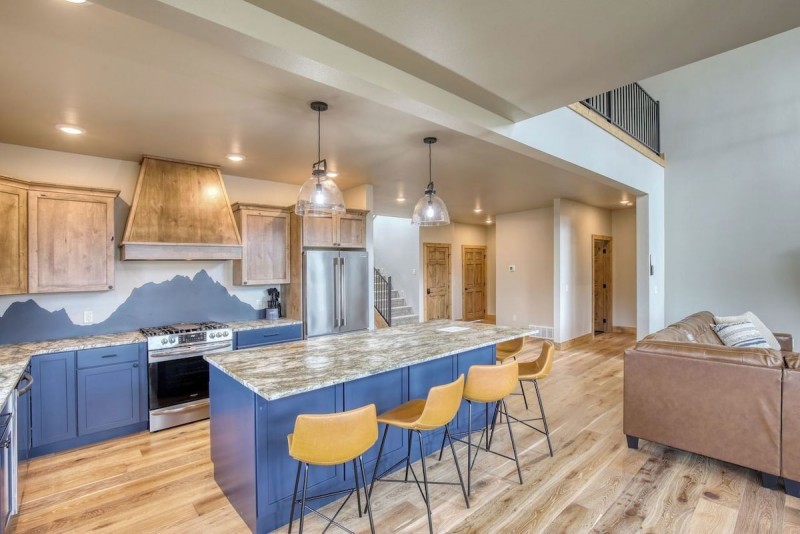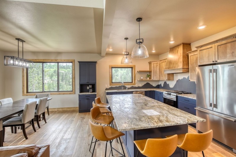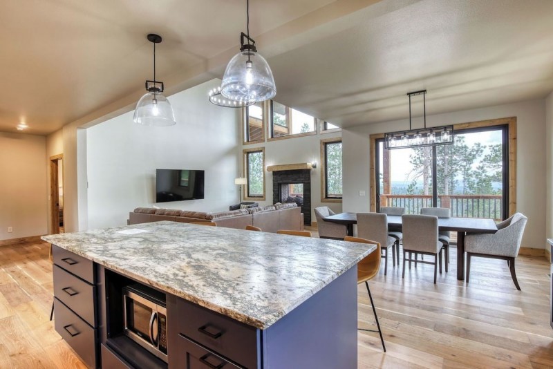 The main level of this newly built home has a spacious kitchen, dining and living area with an inviting open floor plan. The kitchen features granite countertops, stainless steal appliances and everything you need to gather for group meals. Great seating for 12 at the center island and dining table. Sit and relax on the sectional seating or watch TV in the living room while you enjoy the indoor/outdoor fireplace. Upstairs is a 2nd gathering spot with comfy seating and TV.