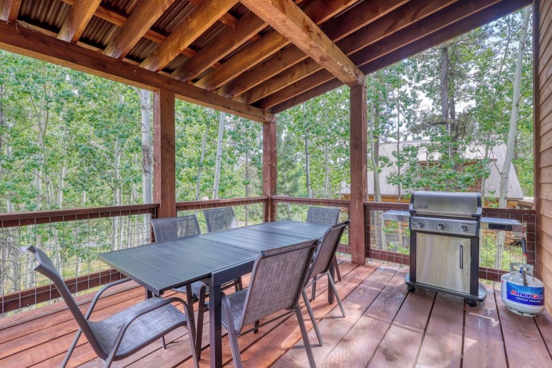 Outdoor Living Space: Sliding glass doors lead to a spacious covered deck with breathtaking mountain views and a BBQ grill