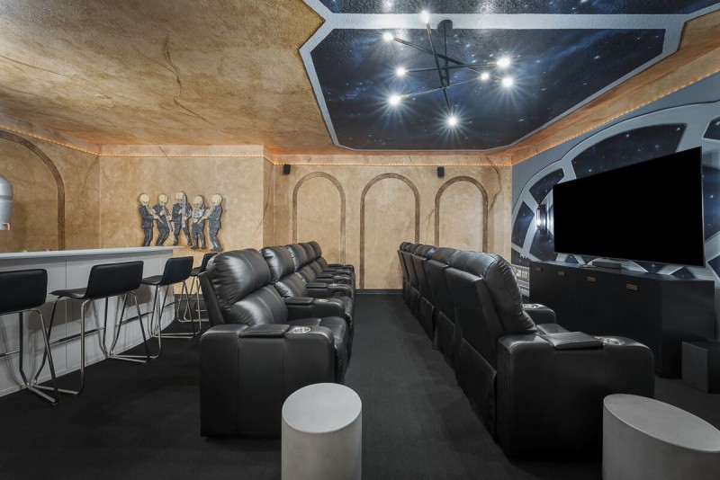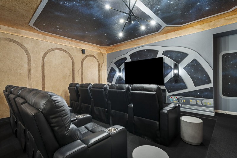 Watch your favorite movies or TV shows after a long day at the parks in this amazing space-themed theater/bar. It offers movie theater seating for 10 with additional seating for 5 in the custom bar. This state-of-the-art custom theater/bar room also comes with a microwave, beverage fridge, mini split AC, custom murals, and artwork. Those looking to play foosball can head to the upstairs loft where there is additional seating, a large wall-mounted smart TV, a foosball table, an extra bar stool with seating for two, and a wall-controlled ceiling fan.