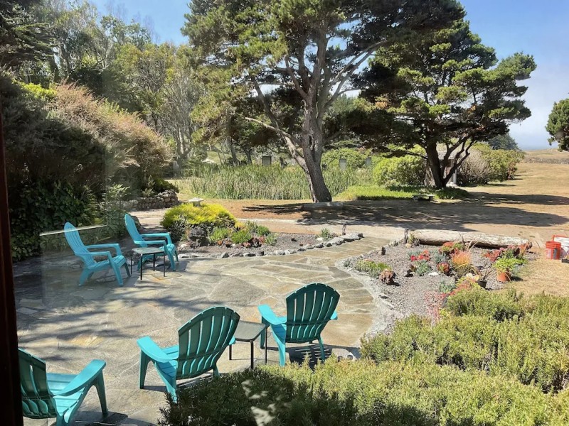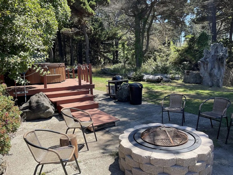 Located on 5 acres adjacent to the Mendocino Coast Botanical Gardens. There is a hot tub and a fire pit area. A beautiful quartz flagstone patio for ocean viewing surrounded by a succulent garden in the theme of an ocean floor. There is rugged path down to private cove for bonfires, exploring and fishing. Camping /RV and pets allowed for fee. Property manager lives on site, separate driveway.