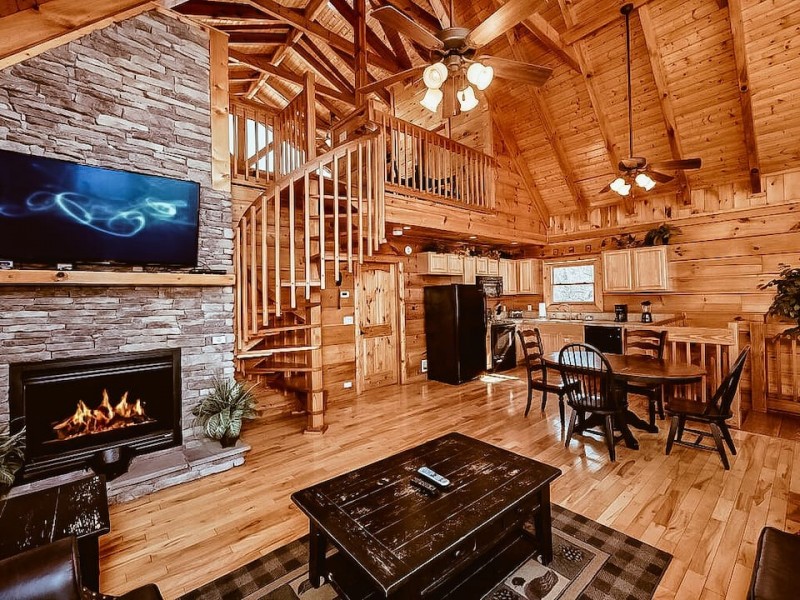 The living room has a queen sleeper sofa, a loveseat, and a flat-screen TV for additional sleeping space. Cozy up by the stone fireplace or sit back and relax after a long day of hiking.