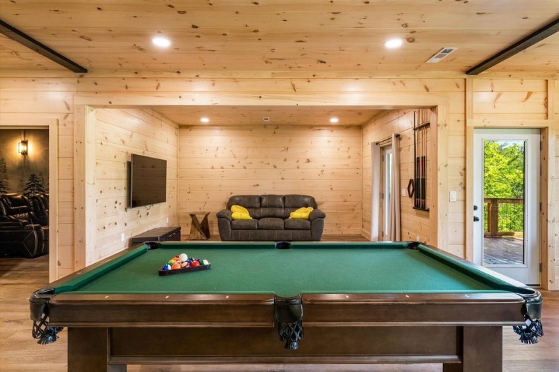 Smokys Haven will deliver a great upscale experience to your Smoky Mountain Vacation! This spacious cabin is located at Smoky Cove Resort and offers a great view. Brand new construction with luxurious bathrooms and features. Game room w/ a pool table, Ping Pong, and foosball. Relax in the sauna or the hot tub, then wind down the day by catching a movie in the theater room with custom-painted walls. The massive, stone-to-ceiling fireplace in the 2-story great room will give you the feeling of being in the lodge of your dreams.