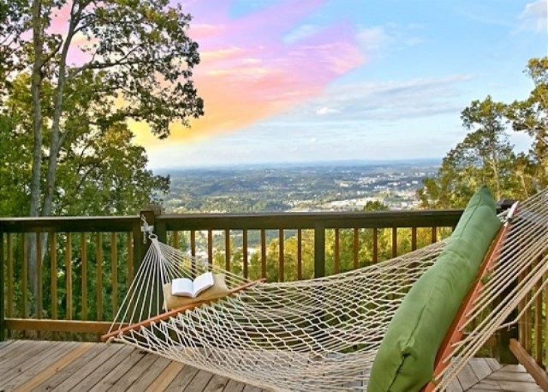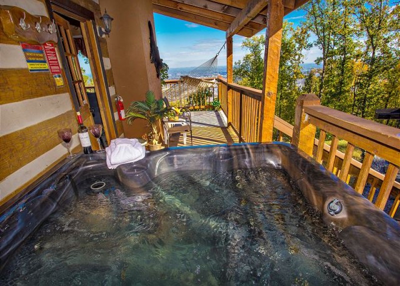 Come and experience THE BEST VIEW in all of Pigeon Forge!! If you are looking for a cabin with a TRULY SPECTACULAR and breathtaking is it!! Eagle's View will take your breath away, featuring a 100 mile view of the city and the Smoky Mountains, PROVIDING THE PERFECT SETTING FOR A TRUE ROMANTIC GETAWAY!!! Perfect for honeymooners, anniversaries and small families. Recently completely updated and decorated with luxurious top of the line décor, Eagle's View will make your vacation dreams a reality as you enjoy front porch living on the wrap-around deck while viewing the majestic mountains and city by day and the grandeur of the sparkling lights by night… it is charming and intimate. Here you will have the feeling of being in seclusion and away from it all, when in reality you are only 5 minutes from Pigeon Forge and all the major attractions of the area including Dollywood, Splash Country, Dolly Parton’s Dixie Stampede, Titanic Museum, Hatfield & McCoys Dinner Show, as well as some of the best restaurants, excellent shopping centers and only 10 to 15 minutes more to Gatlinburg and The Great Smoky Mountain National Park. This is where you'll enjoy absolute privacy and relaxation, and your "home away from home". The open floor plan features vaulted ceilings with floor-to-ceiling picture windows for a panoramic view of the city and beyond on each level. Luxuriously furnished with an elegant leather sleeper sofa, a rustic stone fireplace, and a 42" flat screen TV complete with DVD player. The kitchen is fully equipped and the dining area provides a stylish gathering table so you can enjoy the outstanding views from the large picture windows. You will enjoy complete privacy, deluxe amenities and additional features that include Wireless Internet access. The main bedroom is sumptuous and VERY romantic. It includes a 36" flat screen TV and DVD player. The cabin features a cozy loft with a Queen sized bed facing the spectacular view, along with a 42” HDTV for your enjoyment. Imagine waking up in the mornings feeling like you are flying above the city! And when you are ready to tear your eyes from the view, you can have a blast playing with the vintage FREE PLAY arcade game EQUIPPED WITH 48 GAMES such as Super Pacman, Donkey Kong, Phoenix, Frogger, Galaga, Centipede, Space Invaders, etc. and the assorted board games. You will find yourself spending a lot of time outside; the deck is comfortably furnished with a hammock for two, rocking chairs, a porch swing and a six person hot tub. You can BBQ on the charcoal grill while you look unto the 100 mile view! The outdoor dining set will allow you to enjoy your meals with your own personal private view of the Smokies and when you are done, sip an after dinner drink by the fire pit or make S'mores for dessert! Eagle’s View is the perfect place to relax or have fun and you will be able to enjoy the best of both worlds!! It will be one of your best vacation experiences, creating memories that will last a lifetime! Eagle's View is truly on the edge of paradise and like many previous guests have already done, you will want to return here time and time again after you have experienced this retreat!