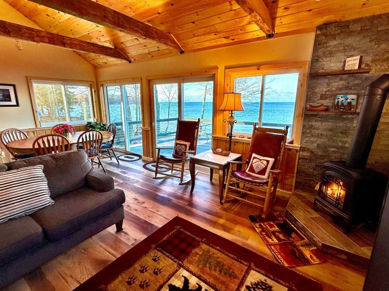 Relax in our lakefront retreat featuring a hot tub, fire pit, and unbeatable views.