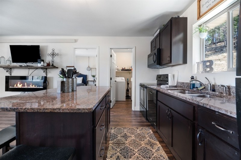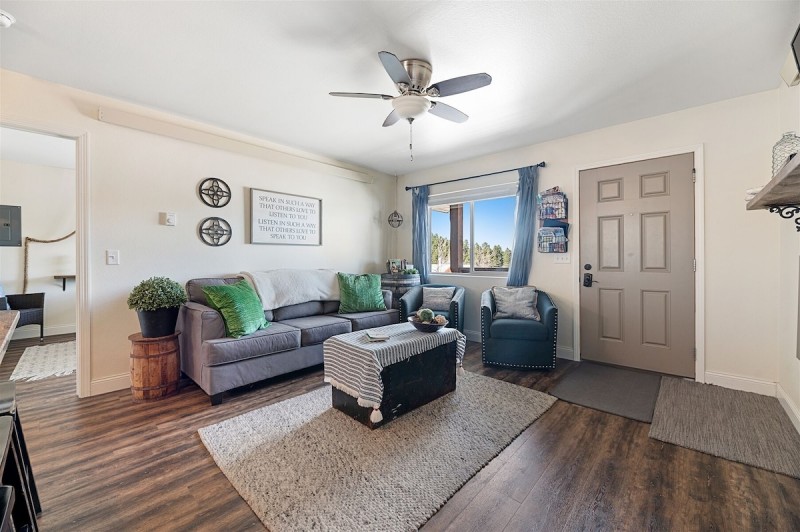 Walk into the main living space with an open floor plan featuring a fully equipped kitchen, island with seating for 5, cozy seating in the living area with a flat screen TV and decorative gas fireplace. Both bedrooms have a queen size bed and TV.