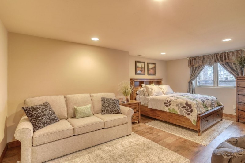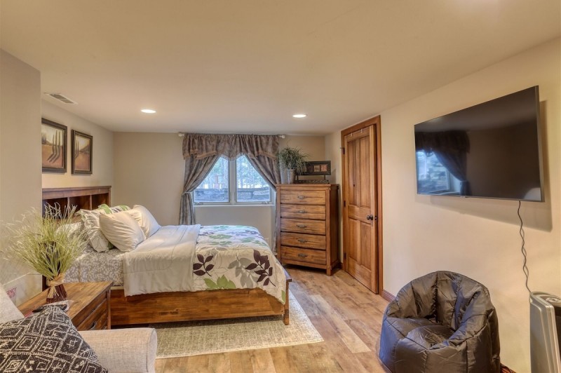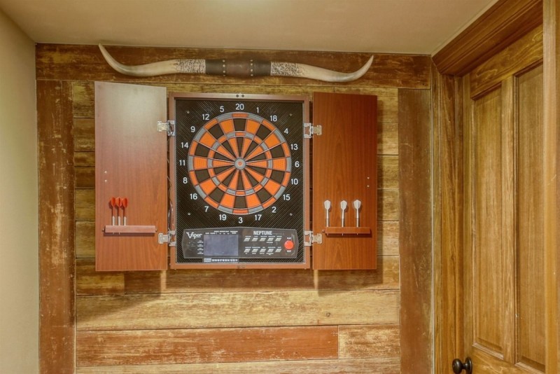The lower level features a game room with a pool table, dart board, a counter area with bar stools and mini fridge. The lower level bedroom has a queen bed and sofa sleeper, flat screen TV and there's a full-size bath downstairs.