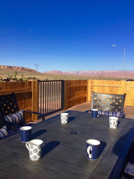 In a tranquil neighborhood on the edge of Page; View of the Vermillion Cliffs from the front courtyards-patio table and BBQ plus elevated front porch, minutes from downtown.
