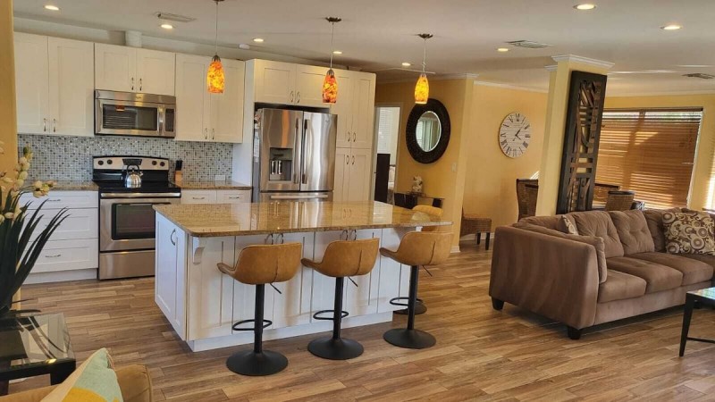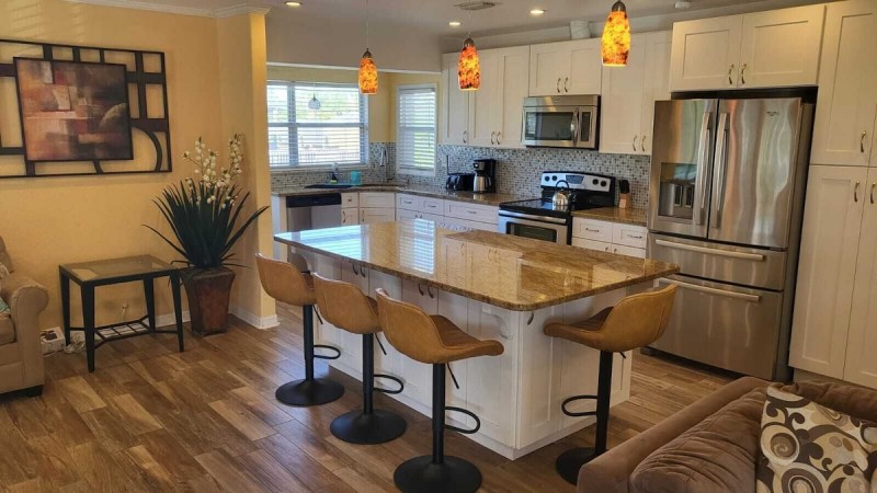 There are 2 parking spots in the driveway. The living space is on open floor plan, all on one comfortable level. Open concept ,great for entertaining with new kitchen, large island, granite counter tops and new stainless steel appliances. Master suite with private bath, king size bed, dresser and 30' TV with DVD. Second bedroom is furnished with a double size bed, dresser and has two closets. For additional guests, there is a extendable double size sleeper sofa in the living room.