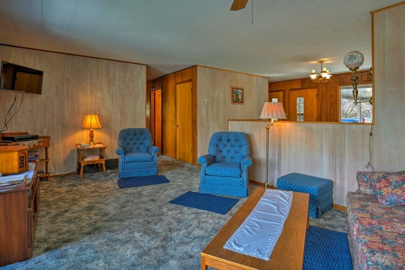 Wooden walls and soft carpets are accented by vintage floral printed furnishings throughout this homey space. Sink into the large sleeper sofa and watch a family-favorite movie on the TV, complete with a DVD and VHS player. Have some family fun and bond over board games like Clue and Monopoly - don't pass Go!