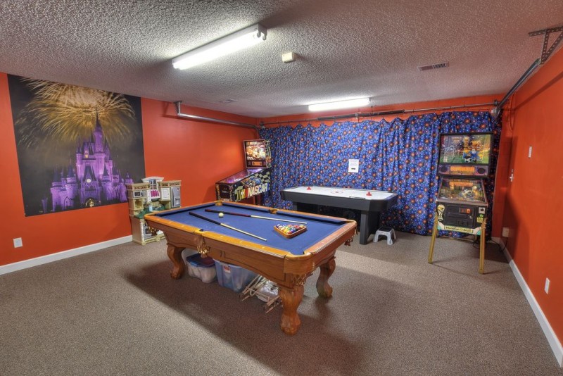 At the end of the hall, past all the bedrooms, is the crown jewel of Mickey’s Family Bungalow, the game room! The game room is fully carpeted, insulated and climate controlled!!! It is decorated with a Disney Castle wall mural complete with fireworks and is equipped with a 7-foot slate pool table, an air-hockey table and a 40-inch, wall-mounted, flat-screen TV. The best part of this game room has got to be the two pinball machines. One is a World Cup Soccer machine and the other is a Nascar machine and both are free to play as much as you like!