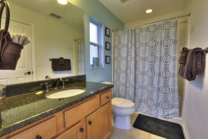 Behind the main living area is the hallway to all the bedrooms in Mickey’s Family Bungalow. The king master suite has hardwood floors, a sliding door to the lanai and pool deck and a walk-in closet. It is furnished with a king bed, luxury bedding and a 40-inch, wall-mounted, flat-screen TV. The king master bath is a full bath with a granite sink top, tile floor and huge shower. The is also a door to the pool deck from the king master bath, so you don’t have to walk through the house with wet feet coming from the pool when nature calls! Just down the hall from the king master bedroom are the two twin bedrooms. The first twin bedroom is Mickey Mouse themed. It has two twin beds, Mickey Mouse bedding and wall décor as well as a 32-inch, wall-mounted, flat-screen TV and an Xbox with an assortment of games. The second twin bedroom is Minnie Mouse themed. It has two twin beds, Minnie Mouse bedding and wall décor as well as a 32-inch, wall-mounted, flat-screen TV and a PlayStation with an assortment of games. The two twin bedrooms share a kid-friendly, themed, full bath with a granite sink top, tiled floors and a tub/shower. The final bedroom in Mickey’s Family Bungalow is the queen master suite. The queen master suite is furnished with a queen bed, luxury bedding and a 32-inch, wall=mounted, flat-screen TV. The queen master bath is a full bath with a granite sink top, tile floor and a tub/shower.