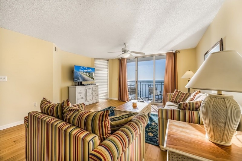 Windy Hill Dunes unit 1104! Oceanfront! Luxury Hi rise! This eleventh floor condo with hi-speed wireless internet - has magnificent oceanfront views of the beach. The oceanfront balcony has access from both the living room and the master bedroom, each of which contains a sliding glass door looking out on the beach. Enjoy the panoramic view of the beach from the living room, dining area, kitchen, as well as the master bedroom. The condo is spacious throughout (1600 square footage), and has ceramic tile floors in the foyer, kitchen, bathrooms and utility rooms. hardwood in all the bedrooms, dining area, and living area. All living areas, bedrooms, and bathrooms are beautifully decorated.