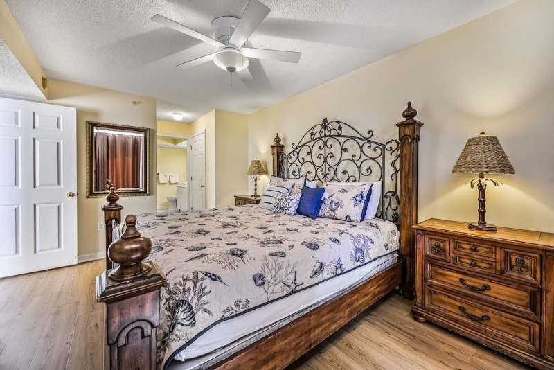 The third bedroom features one queen beds and a flat panel TV. Two bedside stands and a chest of drawers provide ample storage. A spacious closet. Just out side this bedroom is a bathroom with a combination tub and shower.