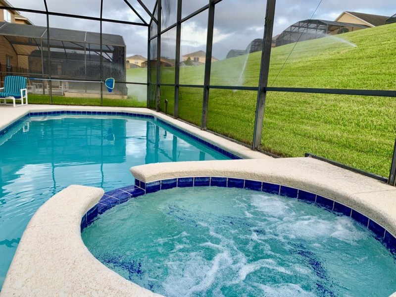 Further details outdoors:: You could step into 15 x 30 foot crystal clear water of the heated pool or really relax in the Jacuzzi or just lie back on one of our comfortable lounger. The pool and lanai are south facing which give you sun all day long. There is an extended lanai, 8ft which is to provide shade and comfort for you from the strong heat of Floridian sun. On the extended deck there is plenty of space for the kids to play and for a table and chairs so you can have a snack and cold drink. Choose to let your worries float away whilst unwinding in the spa or sprawl across one of many comfy deckchairs with a book and get a gorgeous tan. The pool offers a removable safety fence which is ideal for the younger ones and all doors leading to the pool have safety locks and alarms; another useful feature of the villa. Both the sparkling pool and bubbling raised spa can be heated. At night why not switch on the underwater pool lights to create a serene, magical atmosphere, Or fancy a BBQ? No problem.