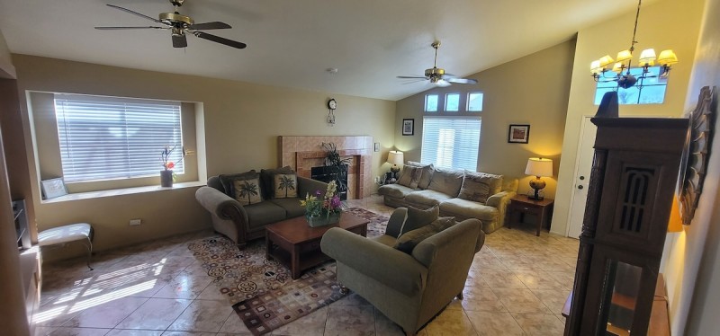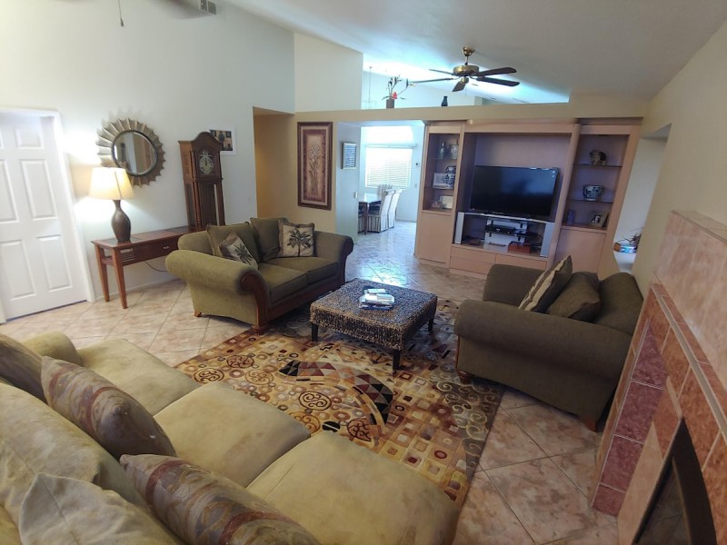 The home living spaces are open with cathedral ceilings, celestial windows, tile floor, granite counters, French doors leading to pool, and outdoor dining/entertaining areas. In the great room watch a 50inch Smart TV, or pick a book and relax by the fireplace. Dining room invites you to a new glass table with six leather chairs. Kitchen is fully equipped and ready for your culinary creations.