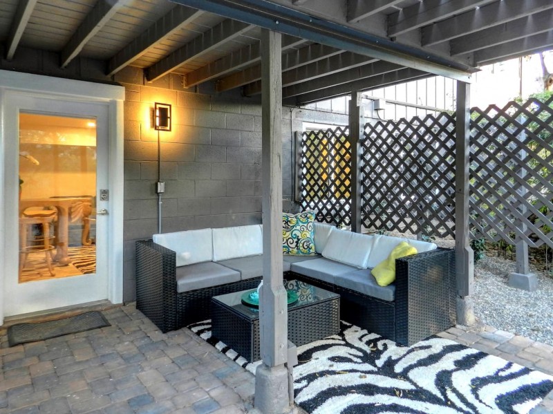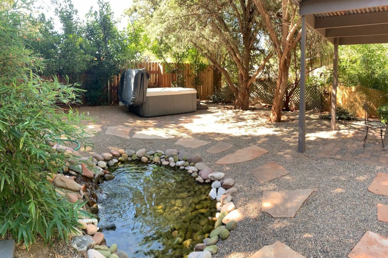 The efficient space has a comfortable luxury bed as well as a sofa sleeper. You can walk to the local brewery or enjoy thousands of acres of red rock trails The enormous backyard with fountain, jacuzzi, shaded relaxing lounge, eating area and barbecue is NOT shared . Pets welcome upon approval