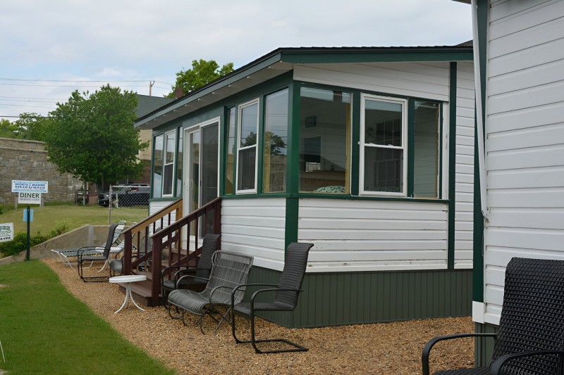 Cottage #9 combines comfort and versatility, featuring a private bedroom with a queen bed, dresser, bureau, flat-screen TV, and A/C. The large living area includes a fully equipped kitchen, 32” flat-screen TV, and an oak-frame futon that unfolds into a full-size bed, providing flexible sleeping arrangements.