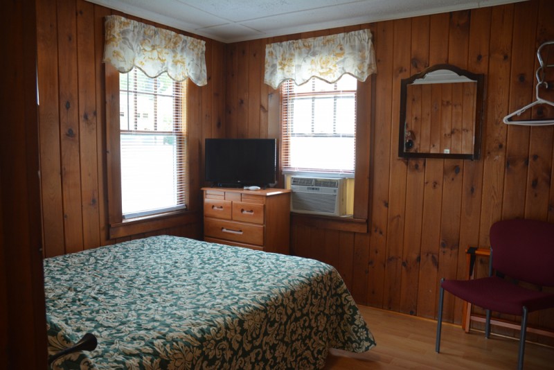 The private bedroom features a cozy queen bed, flat-screen television, and air conditioning for restful nights after a day by the water. An open den area provides additional sleeping space with a twin-over-full bunk bed, making the cottage perfect for families or small groups of up to five guests. The full bathroom includes a shower (no tub) and is thoughtfully maintained for your comfort.