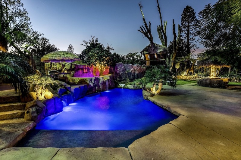 The Enchanted Manor is magical, especially at night. The lighting on the grounds, trees, deck, and pool turns the night into a breathtaking romantic atmosphere. The pool is a saltwater pool so there are no harsh chemicals. There is also an outside shower behind the jacuzzi.