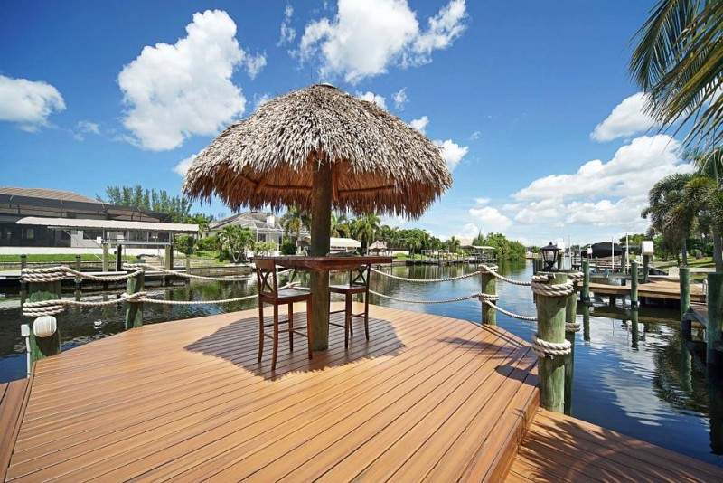 There is a large boat dock for mooring a rental boat at the canal. Enjoy the sunset, perhaps with a summer drink, at the Tiki hut on the boat dock of the villa.