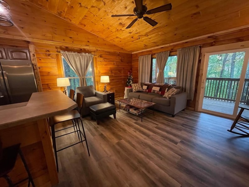 One of the most notable aspects of the Cavalier Cabin is its living spaces. The large, open-concept living room is the perfect place to unwind, whether you’re relaxing with a book, watching a movie, or enjoying some good conversation with loved ones. The room’s large windows offer a beautiful view of the surrounding woods, bringing the outdoors in and providing a sense of tranquility and serenity.