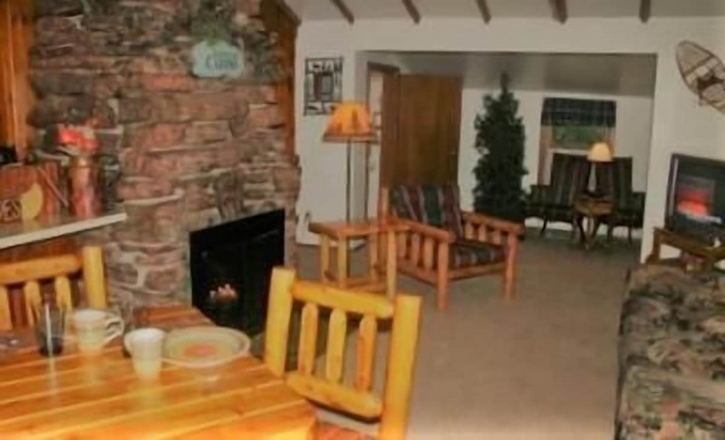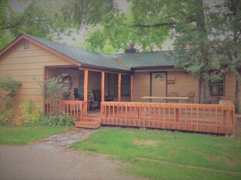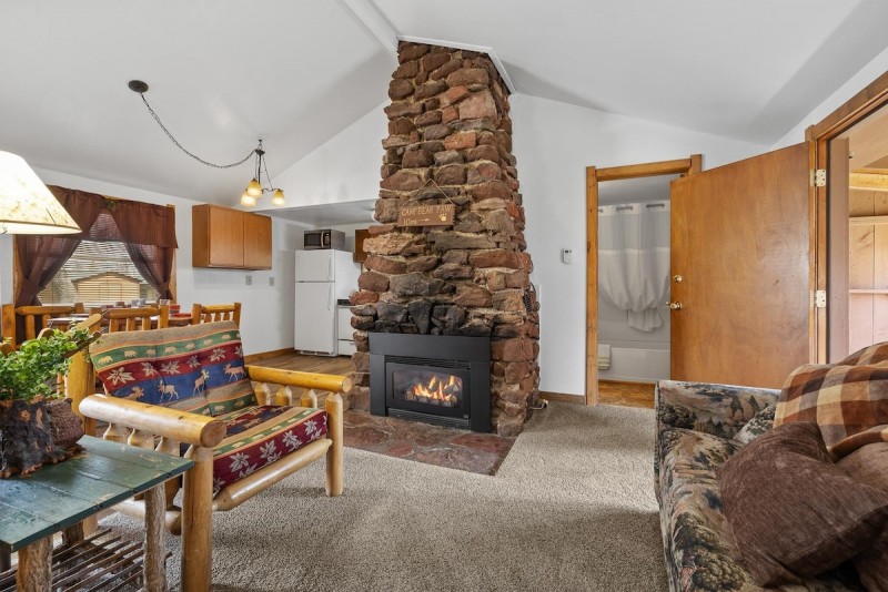 Three bedroom cottage has a queen bed in each bedroom and a futon sleeper in the living room. Tastefully furnished in lodge log decor with a large rock gas fireplace in the living room. Full bathroom with tub/shower. Through the wall air conditioning, cable TV, and wifi for your comfort and relaxation. All bedding, linens, and towels are provided. The full size kitchen comes with a stove/range, refrigerator, microwave, coffee maker, and toaster. It is equipped for basic cooking and eating. Outside on the deck is a gas grill, picnic table, and patio chairs for your evening bar-b-q. The cottages set in a park like setting with mature trees, shade, and lots of lush lawn. Just a short walk to the paved bike path or to the lake for some recreation.