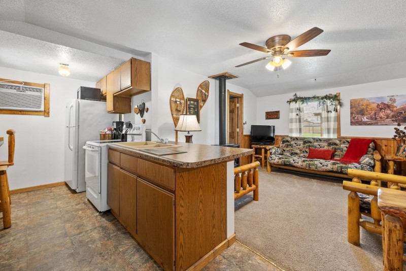 Two bedroom cottage has a queen bed in each bedroom and a futon sleeper in the living room. Tastefully furnished in lodge log decor with a free standing gas fireplace stove in the living room. Full bathroom with shower only. Through the wall air conditioning, cable TV, and wifi for your comfort and relaxation. All bedding, linens, and towels are provided. The full size kitchen comes with a stove/range, refrigerator, microwave, coffee maker, and toaster. It is equipped for basic cooking and eating. Outside on the patio is a gas grill, picnic table, and patio chairs for your evening bar-b-q. The cottages set in a park like setting with mature trees, and lots of lush lawn. Just a short walk to the paved bike path or to the lake for some recreation.