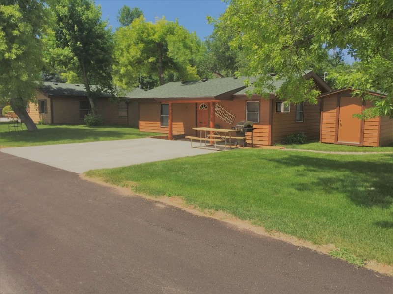 Two bedroom cottage has a queen bed in each bedroom and a futon sleeper in the living room. Tastefully furnished in lodge log decor with a free standing gas fireplace stove in the living room. Full bathroom with shower only. Through the wall air conditioning, cable TV, and wifi for your comfort and relaxation. All bedding, linens, and towels are provided. The full size kitchen comes with a stove/range, refrigerator, microwave, coffee maker, and toaster. It is equipped for basic cooking and eating. Outside on the patio is a gas grill, picnic table, and patio chairs for your evening bar-b-q. The cottages set in a park like setting with mature trees, and lots of lush lawn. Just a short walk to the paved bike path or to the lake for some recreation.