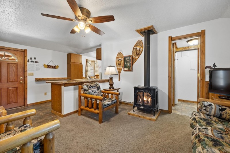 Two bedroom cottage has a queen bed in each bedroom and a futon sleeper in the living room. Tastefully furnished in lodge log decor with a free standing gas fireplace stove in the living room. Full bathroom with shower only. Through the wall air conditioning, cable TV, and wifi for your comfort and relaxation. All bedding, linens, and towels are provided. The full size kitchen comes with a stove/range, refrigerator, microwave, coffee maker, and toaster. It is equipped for basic cooking and eating. Outside on the patio is a gas grill, picnic table, and patio chairs for your evening bar-b-q. The cottages set in a park like setting with mature trees, and lots of lush lawn. Just a short walk to the paved bike path or to the lake for some recreation.
